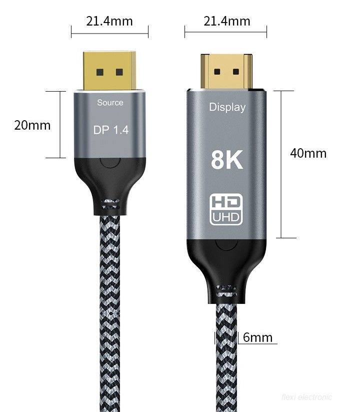 A Flexi DP 1.4 to HDMI 2.1 cable is a high-performance video adapter cable that connects a DisplayPort 1.4 source to an HDMI 2.1 display.